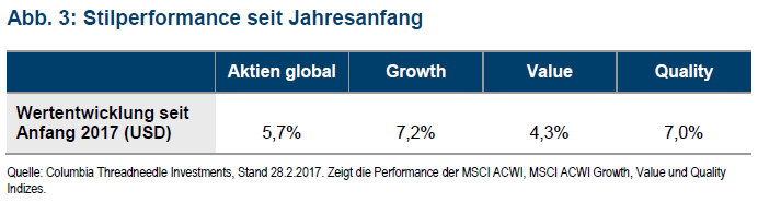 Tatsächlich gibt es bereits Anzeichen dafür, dass der Markt stärker zwischen Unternehmen differenziert, deren Fundamentaldaten weitere Kursgewinne rechtfertigen, und jenen, bei denen dies nicht der Fall ist. So haben sich in den ersten beiden Monaten des Jahres sowohl Growth- als auch Quality-Werte sehr gut entwickelt (Abb. 3).