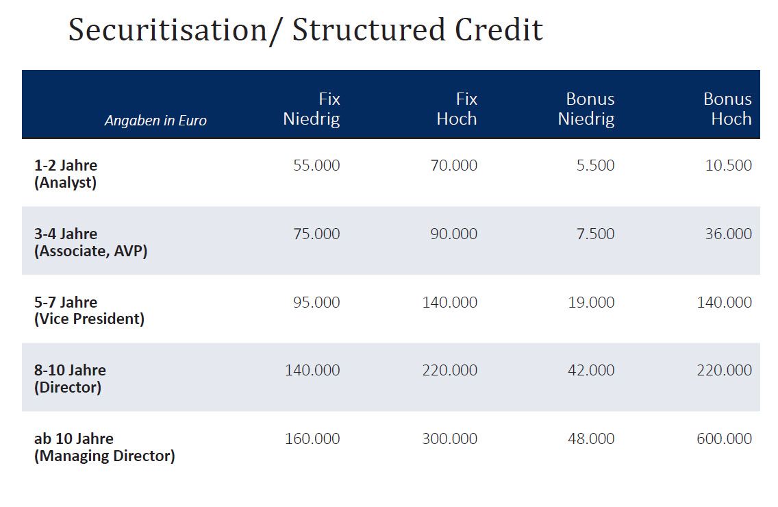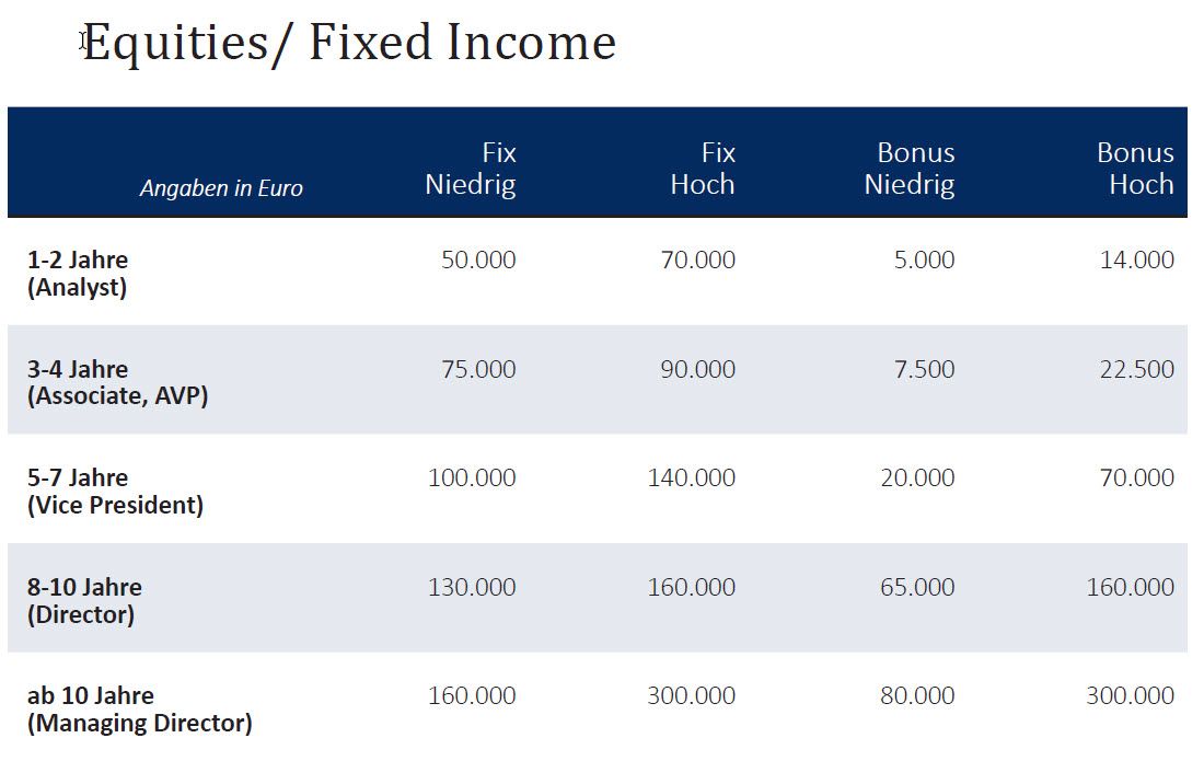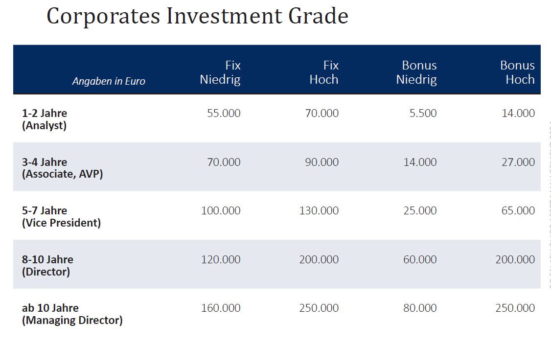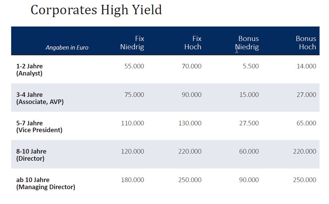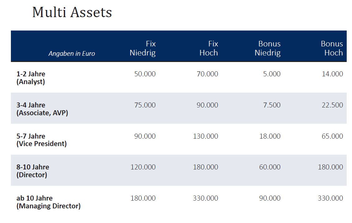 Selbst Berufseinsteiger im Fondsmanagement stehen mit bis zu 70.000 Euro im Jahr gut da. Bei Managing Directors erreicht das Jahresgehalt laut Banking Consult sogar bis zu 330.000 Euro. Die Spannbreite der Gehälter und Boni hängt aber neben der Berufserfahrung auch wesentlich von den Anlageklassen ab, die betreut werden. Die genauen Details zu Gehältern und Boni können Sie in der Bildergalerie unten abrufen. Hier lesen Sie den zweiten Teil des Gehaltsreports.