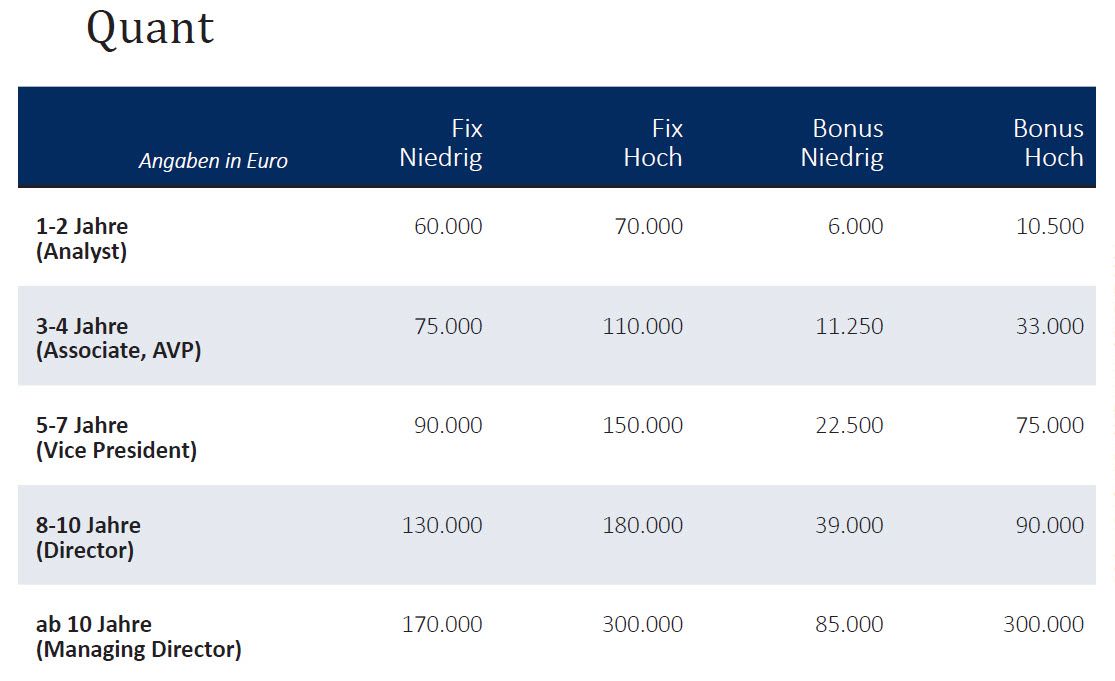 Der Studie von Banking Consult zufolge können sich Portfoliomanager in Deutschland nicht über eine zu geringe Entlohnung beklagen. Ein Portfoliomanager mit mehr als sieben Jahren Berufserfahrung etwa verdient laut Studie derzeit bis zu 220.000 Euro im Jahr. Hinzu können Boni in Höhe von bis zu 220.000 Euro pro Jahr hinzukommen.