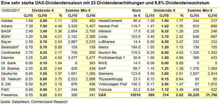 Spätestens nachdem am Donnerstag HeidelbergCement als letztes DAX-Unternehmen seine Dividende für das Geschäftsjahr 2016 angekündigt hat, war klar, dass sich DAX-Aktionäre erneut über insgesamt hohe Ausschüttungen freuen dürfen. HeidelbergCement war das 23. DAX-Unternehmen, das die Dividende angehoben hat, während nur zwei DAX-Unternehmen ihre Dividende gesenkt haben.