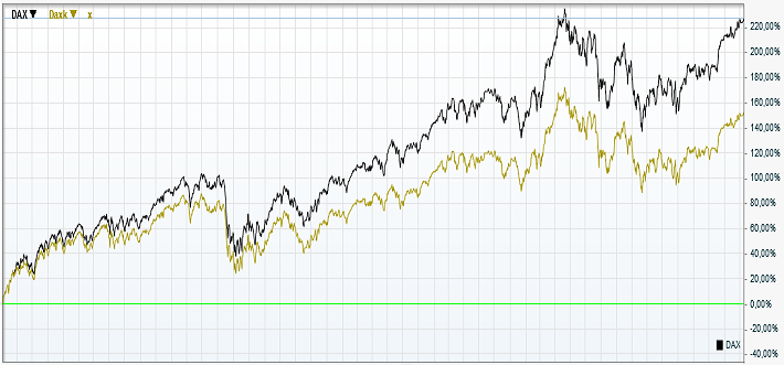 Grafik: DAX Performance-Index und DAX Kurs-Index seit März 2009 im Vergleich