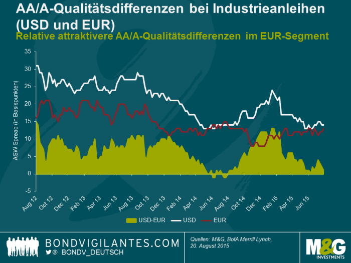 Der nachfolgende Chart illustriert, wie sich der sogenannte Asset Swap (ASW) Spread bei Industriepapieren (sowohl in USD als auch in EUR) im Hinblick auf die Bonitäten AA und A während der letzten drei Jahre entwickelt hat. Darüber hinaus zeigt die Grafik auch die Differenz zwischen den AA/A-Qualitätsdifferenzen auf USD- und EUR-Basis.