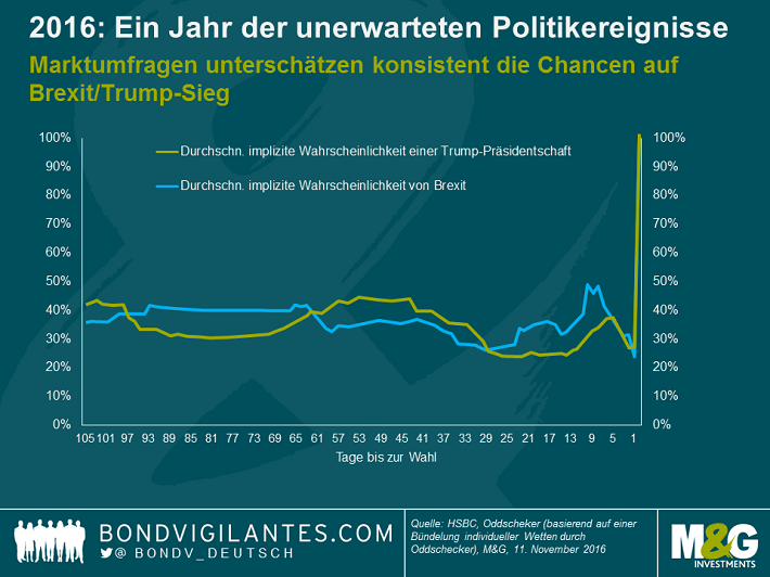 Das Ergebnis der US-Präsidentschaftswahl war angesichts der vorherigen Umfrageergebnisse eine Überraschung, doch war die Kürze der „Risk-off“-Periode an den Anleihenmärkten mindestens ebenso unerwartet. Als Großbritannien im Juni seinen eigenen Polit-Schock durchlebte, kam es zu einer Bilderbuchflucht in Qualität, ein Sturm auf Staatsanleihen weltweit. Die Anleihenkurse für 10-jährige US-Papiere legten am Tag nach dem Referendum um 2% zu und erreichten ihren Höhepunkt zwei Wochen später. Als ein vorrangig britisches Ereignis war die Umschichtung in britische Staatsanleihen sogar noch ausgeprägter. Die Renditen auf 10-jährige Gilts fielen in den nächsten sechs Wochen im August auf ein historisches Tief von 0,5%, woran die QE-Ankündigungen ebenfalls mitverantwortlich waren.