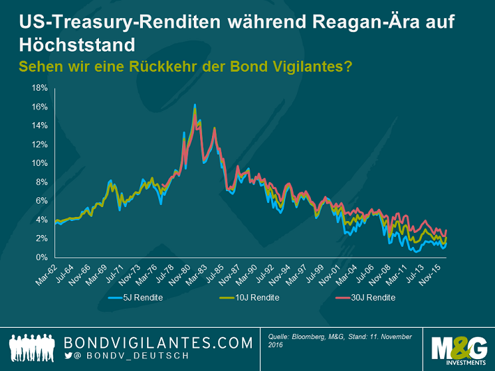 Der Begriff „Bond Vigilantes“ spielt auf die Fähigkeit des Anleihenmarktes an, sozusagen über die Fähigkeit der Regierung zu wachen – oder sie im Zaum zu halten –, nicht übermäßig viel auszugeben oder zu leihen. Aus Protest gegen eine bestimmte Geld- oder Fiskalpolitik können Investoren ihre Anleihen verkaufen und so die Renditen nach oben treiben. Der Name („Vigilantes“ – auch Bürgerwehr) deutet zwar auch eher Unheilvolles und Bewusstes an, es ist aber letztlich lediglich ein Begriff, der die unkoordinierten Handlungsweisen einer großen Zahl an rationalen Wirtschaftsakteuren beschreibt. Der Begriff wurde von Edward Yardeni in Reaktion auf die Reagan-Ära geprägt, während der die expansive Fiskalpolitik zu Anfang der 1980er Jahre dazu führte, dass die Investoren nach deutlich höheren Erträgen von den Staatsanleihen verlangten. Als Reagan ins Amt kam, übernahm er eine schwerfällige Volkswirtschaft und eine Inflation von fast atemberaubenden 15%. Er schlug den „Economic Tax and Recovery Act“ vor, eine Gesetzesvorlage zur Steuersenkung bei gleichzeitiger Reduzierung der Sozialausgaben. Die Renditen kletterten auf ein Allzeithoch. Solche auf 5-jährige Titel stiegen auf 16,3% und waren damit sogar noch höher als die 15,8% auf 10-jährigen Anleihen und die 15,2% für 30-jährige Papiere. Die kurzfristigen Ausfallrisiken wurden als legitime Sorge eingepreist, obwohl die Schuldenquote lediglich 30% betrug. Gegenwärtig sind es 90%. Reagan hatte deutlich mehr Spielraum als Trump. Es ist an der Zeit, dass wir mal wieder unseren Reinhart und Rogoff aus dem Bücherregal holen.