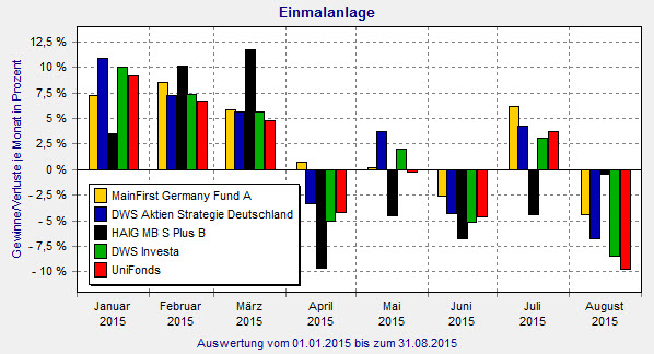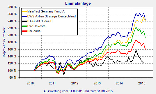 Die stärkste Performance per 31. August 2015 kann der MainFirst Germany Fund (ISIN: LU0390221256) vorweisen - 23 Prozent legt er zu. Zwar musste er im August einen Verlust von 4,4 Prozent hinnehmen, dennoch glänzt er mit der FondsNote 2. Alleine in den letzten fünf Jahren erzielter er ein Plus von 140 Prozent. Zum Vergleich: Die Kategorie Aktienfonds Deutschland schaffte in diesem Zeitraum 70 Prozent. Das Volumen von 72,2 Millionen Euro wird in Aktien jeder Marktkapitalisierung angelegt. Standardwerte sollen jedoch zu mindestens 50 Prozent im Fonds vertreten sein. Derzeit liegen 9,5 Prozent in Sixt SE, 8,4 Prozent in All for One Midmarket und 5,9 Prozent in den Bayerischen Motorenwerken.