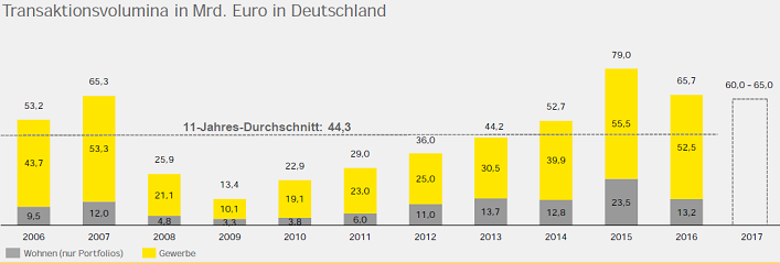Am Immobilienmarkt wird immer weniger Geld umgesetzt. Schon 2016 hatte es im Vergleich zum Vorjahr einen spürbaren Rückgang von 79 auf 66 Milliarden Euro gegeben. Der Trend wird sich laut aktuellem Trendbarometer Immobilien-Investmentmarkt 2017 der Beratungsagentur EY wohl fortsetzen. Doch von einer Wende am Immobilienmarkt kann trotzdem keine Rede sein. Im Gegenteil: Der Grund für die Entwicklung liegt laut Christian Schulz-Wulkow, Partner und Leiter des Immobiliensektors bei EY für Deutschland, Österreich und die Schweiz, zu einem wesentlichen Teil auf der Angebotsseite: „Der Mangel an verfügbaren Investments hat weiter zugenommen, und immer mehr Eigentümer halten ihre Immobilien langfristig, statt sie zu veräußern.“