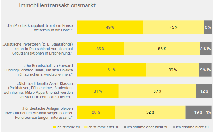 „Forward Fundings beziehungsweise Forward Deals sind derzeit sehr populär“, so Schulz-Wulkow. „Die Käufer sind bereit, aufgrund der Produktknappheit höhere Risiken in Kauf zu nehmen und auch in andere Länder auszuweichen, die eine höhere Rendite bieten.“ Das bestätigen rund 80 Prozent der Befragten. Auch „nichttraditionelle“ Assetklassen wie beispielsweise Parkhäuser, Pflegeheime, Studentenwohnheime und Mikro-Apartments stehen zunehmend auf dem Einkaufszettel der Investoren (88 Prozent der Befragten).