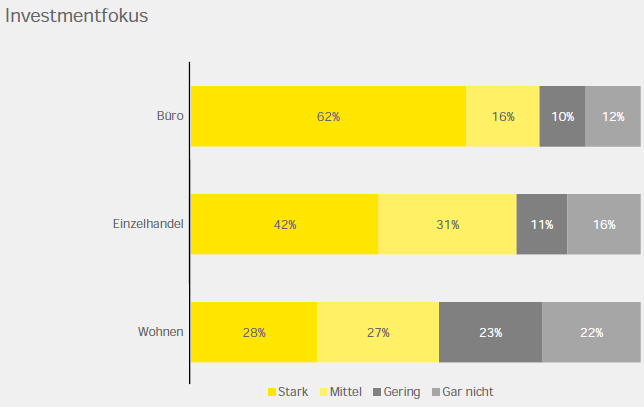 Dafür erlebt die Büroimmobilie ein Comeback: Hier setzen 62 Prozent der Befragten ihren Schwerpunkt, im vergangenen Jahr waren es nur 49 Prozent. Dazu trägt auch eine zunehmende Flächeneffizienz durch moderne Bürokonzepte bei – mit 97 Prozent Zustimmung der Befragten kristallisiert sich diese Entwicklung als Trend für das begonnene Jahr heraus.