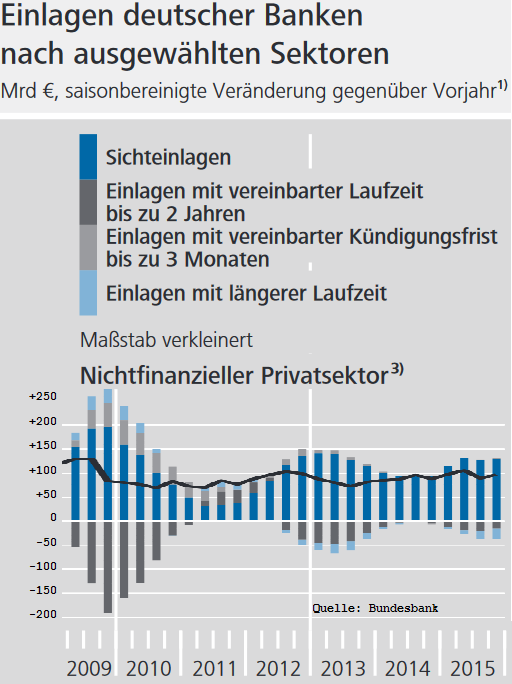 Während langfristige verzinste Geldanlagen immer weniger nachgefragt werden, parken private Anleger und Unternehmen immer mehr Geld sehr kurzfristig. Die Bundesbank interpretiert das so: „Die Vorhaltung liquider Mittel“ ermögliche es, „geplante Sachinvestitionen aus eigenen Mitteln zu finanzieren“. Unter dem Strich bedeutet das, dass für Konsum und Investitionen in Deutschland weniger Schulden aufgenommen werden. Der Masterplan der EZB sieht eigentlich etwas anderes vor.