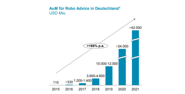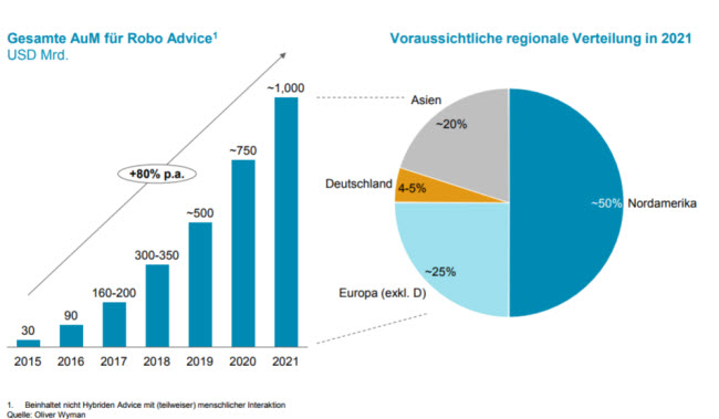 Dennoch wächst der Markt hierzulande stärker als erwartet. Matthias Hübner, Partner und Experte für Asset Management bei der Beratungsagentur Oliver Wyman zeigte sich überrascht: „Mit dem aktuellen Stand von 800 Mio. Euro wurde unsere bisherige Jahresschätzung schon früh erreicht“, so Hübner. Setze sich der Wachstumstrend in dieser Weise fort, könnte noch vor Jahresende die Schallmauer von einer Milliarde Euro verwaltetem Vermögen durchbrochen werden. Entsprechend passte Oliver Wyman seine globale Wachstumsprognose an. Noch im Oktober 2016 schätzte das Unternehmen das weltweite Assetpotenzial auf knapp 500 Mrd. USD bis zum Jahr 2020. Jetzt halten die Experten eine Summe von gut 1 Bio. USD bis 2021 für realistischer.