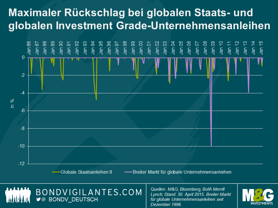 In der nachfolgenden Grafik werden die Rückschläge (Entwicklung vom Höchst- zum Tiefststand) an den Märkten für globale Staatsanleihen sowie für globale Unternehmensanleihen mit Investmentstatus seit der Zusammenstellung der jeweiligen Indizes (1986 für den Staatsanleihen-Index und 1996 für den Index für globale Unternehmensanleihen mit Investmentstatus) auf Basis der monatlichen Gesamterträge gegenübergestellt.
