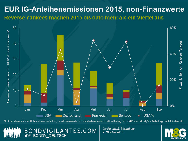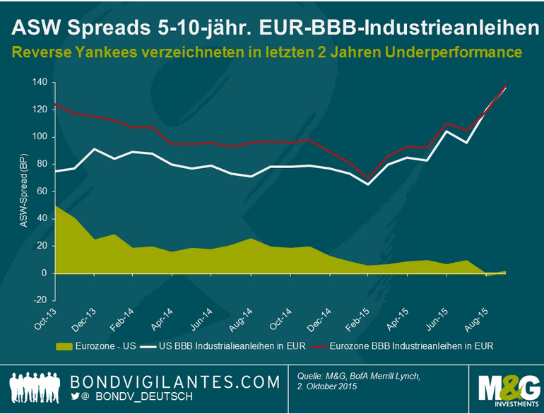 In den letzten zwei Jahren haben Reverse Yankees in Euro verglichen mit Anleihen von Emittenten aus der Eurozone eine Underperformance verzeichnet. Im Oktober 2013 konnten Investoren fast 50 Basispunkte einfahren, wenn sie von Reverse Yankees zu Eurozone-BBBs umschichteten. Diese Spreaddifferenz hat sich mittlerweile in Luft aufgelöst. Das Zusammenlaufen der Spreads lässt sich teilweise durch Verbesserungen in der europäischen Peripherie erklären, die zu einer Verengung der durchschnittlichen Spreads in der Eurozone geführt haben. Reverse-Yankees-Investoren waren allerdings noch nicht in der Lage, die Vorteile durch die Neubewertung der Peripherierisiken in den USA zu genießen, da die Spreads im Bereich von US-amerikanischen Industriepapieren bis Anfang 2015 im Großen und Ganzen unverändert blieben. Seitdem haben sich sowohl die Spreads der Anleihen aus der Industrie in den USA und der Eurozone geweitet. Die Hauptgründe waren zum einen die risikoscheue Stimmung und zum anderen das große Neuemissionsvolumen bei EUR-IG-Unternehmensanleihen.