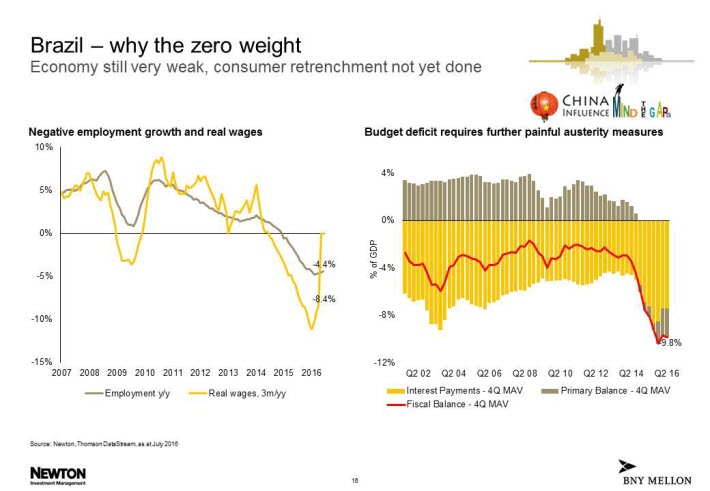 Nicht nur deshalb sei Brasilien in seinem Depot derzeit mit genau Null gewichtet. „Schlechte Staatsfinanzen gepaart mit hoher Korruption, negatives Wachstum, steigende Arbeitslosigkeit. Das sind derzeit keine einladenden Faktoren für ein Investment in Brasilien“, sagt Robert Marshall-Lee.