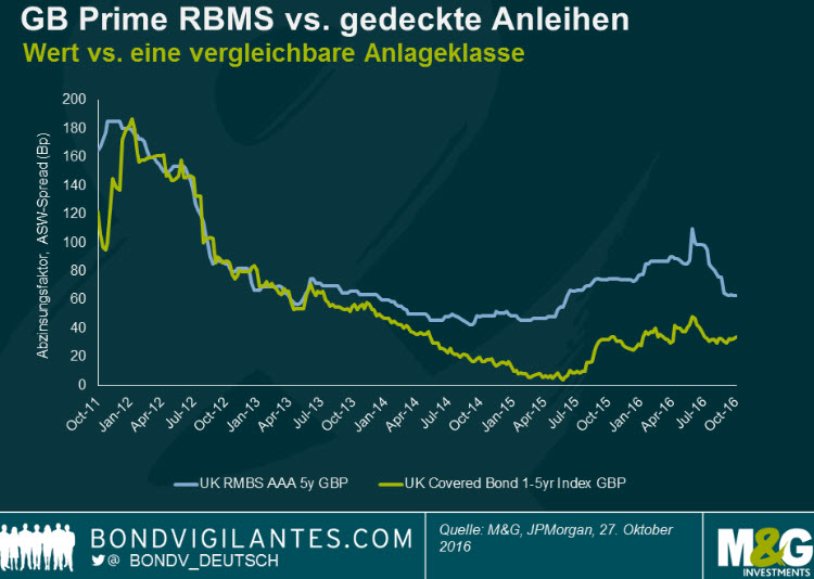 Mit Blick auf die Spread-Niveaus sieht der RMBS-Sektor verglichen mit Unternehmensanleihen weiterhin attraktiv aus. Am oberen Ende des Marktes bieten AAA-Anleihen, die mit britischen Prime-Hypotheken (Standarddarlehn von Großbanken) unterlegt sind, gegenüber gedeckten Schuldverschreibungen mit ähnlichen Fälligkeiten eine Prämie von ca. 30 Bp, obwohl diese mit fast identischen Sicherheiten unterlegt sind.