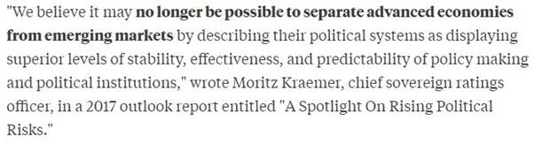 4. Mir fiel es seinerzeit nicht auf (Dezember), aber Tracy Alloway von Bloomberg erinnerte mich gestern an den Ausblick 2017 von S&P, verfasst von dem exzellenten Moritz Kraemer („A Spotlight on Rising Political Risk“). Dieses Zitat aus dem Dokument schreckt ab und übertreibt vielleicht den Zerfall der demokratischen und rechtlichen Institutionen, die den Industriestaaten in der Vergangenheit einen Rating-Vorteil gegenüber den Schwellenländern verschafften.