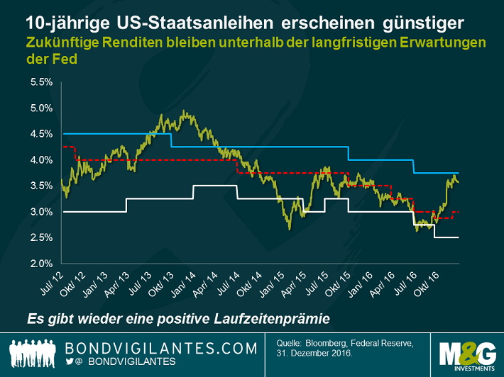 Seit den Wahlen in den USA preist der Markt für US-Staatsanleihen mittlerweile eine Laufzeitenprämie von über 50 Basispunkten ein und ist damit im Vergleich zur durchschnittlichen Leitzinserwartung der Mitglieder des Offenmarktausschusses wohl „günstig“. Gibt es Gründe dafür, weshalb dieses einfache Modell falsch liegen könnte? Natürlich gibt es die. Die Laufzeitenprämie ist eventuell nicht ausreichend, womöglich aufgrund des „chinesischen Nachfrage-Faktors“, auf den ich weiter unten eingehe. Oder der Offenmarktausschuss und die Märkte korrigieren ihre Erwartungen für die langfristigen Leitzinsen deutlich nach oben. Schließlich lag der Mittelwert im Jahr 2012 noch bei 4,25%. Wenn Trump es ernst meint mit dem Ziel für das reale BIP von 4%, werden sich die Zinsen wieder in diese Richtung bewegen.