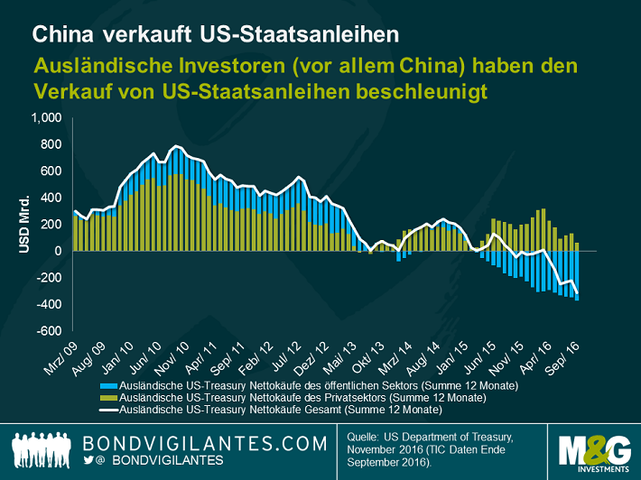 2. Ende 2001 trat China der Welthandelsorganisation (WHO) bei. Seitdem häufte das Land, basierend auf den Einnahmen des Außenhandels, zu Spitzenzeiten 4 Billionen USD an. Ein Großteil davon floss in den Markt für US-Staatsanleihen – China hält 20% des Marktes und Japan hält weitere 20%. Unseren Schätzungen zufolge liegt die Rendite für 10-jährige US-amerikanische Staatsanleihen aufgrund der Käufe aus China um 50 Basispunkte niedriger als es ansonsten der Fall gewesen wäre.Die unten aufgeführte Grafik zeigt jedoch, dass sich China seit Beginn der Wachstumsverlangsamung im Jahr 2012 von einem Nettokäufer von US-Staatsanleihen zu einem Nettoverkäufer entwickelt hat. Darüber hinaus sind seit Anfang 2016 ausländische Investoren insgesamt Nettoverkäufer von US-Staatsanleihen. Was in dem Jahrzehnt bis 2016 einst ein kräftiger Rückenwind für den US-Staatsanleihenmarkt war, ist mittlerweile zum Gegenwind geworden. Vielleicht wäre eine höhere Laufzeitenprämie aus diesem Grund angemessen.