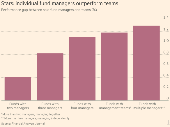 Doch für Anleger sind Teams nicht automatisch besser als ein Einzelkämpfer, der alleine einen Fonds managt. Das zeigt eine Studie, die vor kurzem im Financial Analysts Journal veröffentlicht wurde. Das Ergebnis: Fonds mit einem Single-Manager laufen im Durchschnitt deutlich besser als Fonds, die von Teams geleitet werden – und zwar um bis zu 1,3 Prozent pro Jahr.