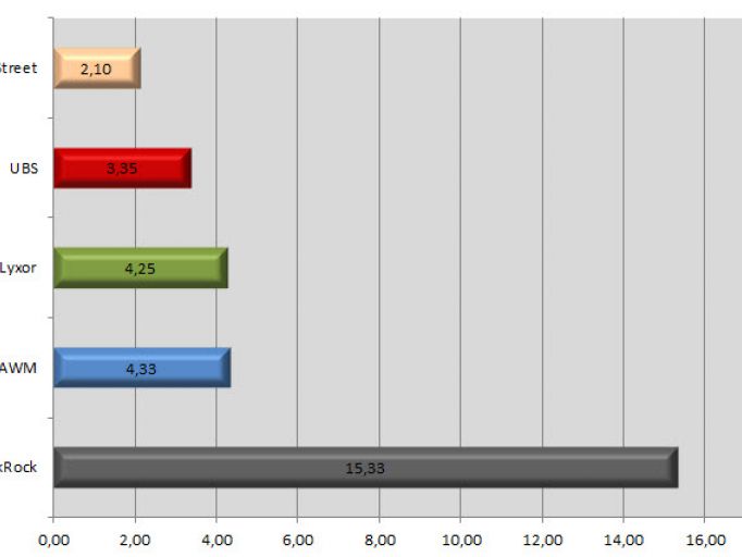 Wenig überraschend verwaltet die BlackRock-Tochter iShares mit 219,7 Milliarden Euro Assets under Management weiterhin das größte Vermögen in Europa. Der Marktanteil liegt bei 48,1 Prozent. Die Deutsche Asset & Wealth Management (DeutscheAWM) folgt mit einem Gesamtvermögen von 56,4 Milliarden Euro dahinter. Marktanteil: 12,3 Prozent. Drittstärkste Kraft in Europa ist Lyxor mit Assets in Höhe von 49,5 Milliarden Euro vor UBS mit 24 Milliarden Euro.