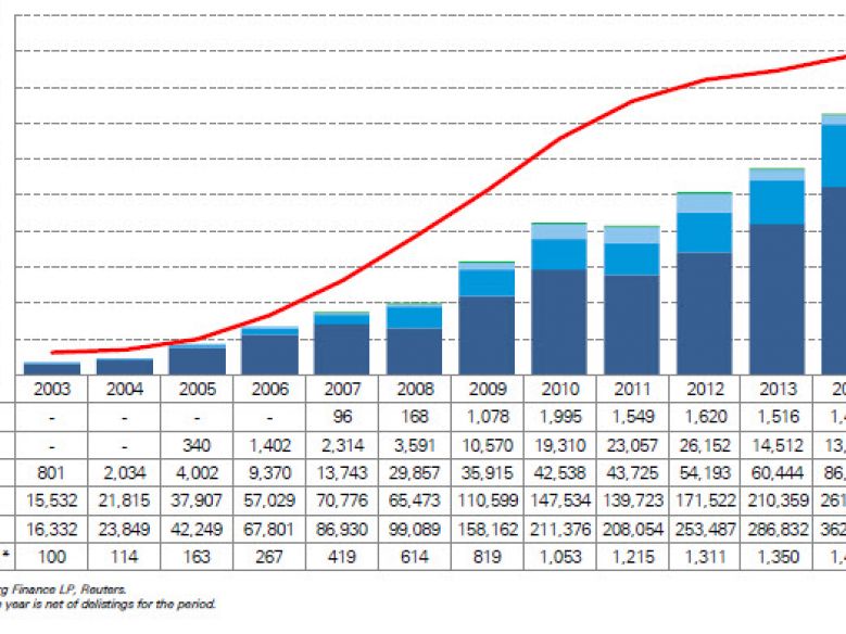 Der ETF-Boom geht weiter: Am 10. April 2015 verwalteten Exchange Traded Funds (ETFs) weltweit knapp 2,8 Billionen US-Dollar. Damit stieg das Vermögen seit Jahresbeginn um gut 200 Milliarden US-Dollar an. 93,6 Milliarden US-Dollar davon waren reine Nettomittel-Zuflüsse. Das Geld ist global in 3.522 Produkten angelegt – 65 mehr als zu Jahresbeginn. Das geht aus einer aktuellen Statistik der Deutschen Bank hervor (Stand: 10. April 2015).