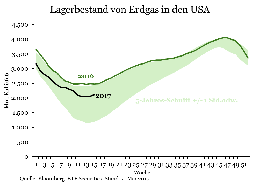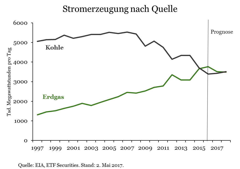 Die US-Produktion von Erdgas wird sich in diesem und nächstem Jahr stark ausweiten, da Investitionsprojekte ans Netz gehen, die in einer Zeit höherer Preise initiiert wurden. Der Produktionsrückgang von 2016 kehrt sich damit um. Zugleich wird der US-Verbrauch den Erwartungen zufolge in diesem Jahr sinken und sich eventuell erst im folgenden Jahr wieder erholen.