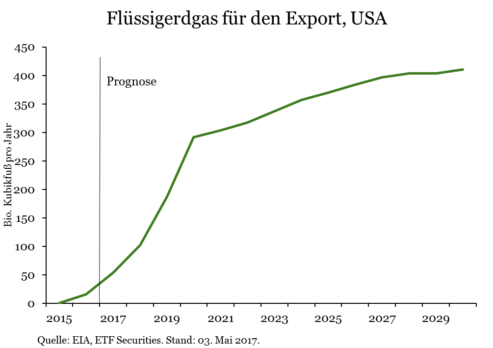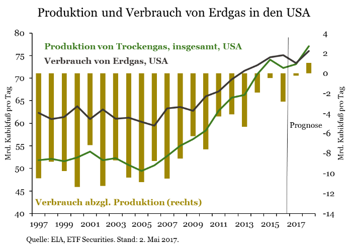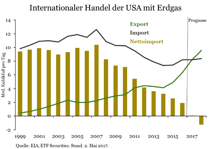 Da die heimische Produktion über dem Verbrauch liegt, wird die Abhängigkeit der USA von Erdgasimporten deutlich abnehmen. Im Kalenderjahr 2018 – und vierteljährlich gerechnet sogar schon im dritten Quartal 2017 – werden die USA erstmals zum Nettoexporteur von Erdgas.