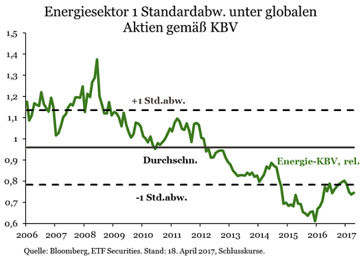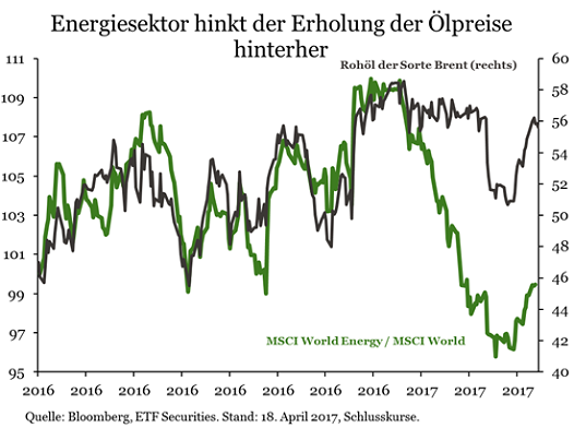 Die Entwicklung des Energiesektors hinkt der Erholung der Rohölpreise hinterher. Die Bewertungen im Energiesektor preisen bereits einen pessimistischeren Ausblick für Rohöl ein, obwohl kurzfristig durchaus Unterstützungen vorhanden sind.
