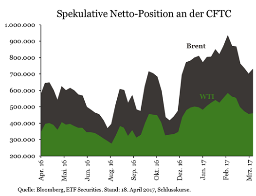Zunächst erscheint die Positionierung auf dem Terminmarkt ausgewogener als zuvor. Seit wir Ende Februar darauf hinwiesen, dass sich die spekulative Long-Position von Rohöl auf einem Extremniveau befindet, hat sie sich wieder ermäßigt. Sie wirkt heute ausgeglichener, sodass das Abwärtsrisiko weiterer Notverkäufe entsprechend gesunken ist.