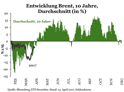 Zweitens beginnt nun die für Rohöl günstigste Jahreszeit. Im Schnitt der letzten zehn Jahre tendierten die Rohölpreise von März bis August aufwärts, da sich die wartungsbedingten Raffinerieschließungen in diesem Zeitraum und der Beginn der „Fahrsaison“ in den USA meist stützend auswirken.