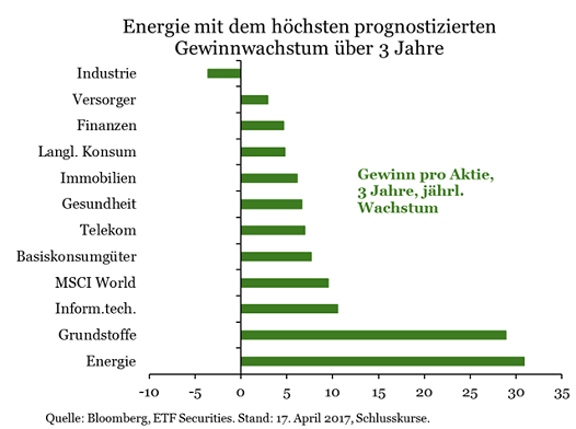 Blickt man auf das KGV, erscheint der Sektor allerdings weniger attraktiv, da sich die Gewinne noch nicht vollends erholt haben. Über die nächsten drei Jahre jedoch prognostiziert der Konsens für den Energiesektor das höchste Gewinnwachstum aller Sektoren.