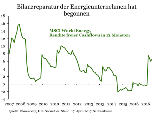 Positiv hervorzuheben ist, dass das Kreditrisiko des Energiesektors viel geringer ist als vor drei Jahren: Der jüngste Rückgang der Rohölpreise führte nicht zu einer Aufblähung der Risikoaufschläge hochverzinslicher Energieanleihen, weil die globalen Ölgesellschaften eine Phase beispielloser Kosten¬senkungen und Investitionskürzungen hinter sich haben. Laut IHS Markit fielen die vorgelagerten Investitions- und Betriebskosten in Nordamerika 2015 um 50 Prozent und 2016 um 35 Prozent – und damit so stark wie zuletzt vor 30 Jahren. Dies trug dazu bei, dass die Rendite des prognostizierten freien Cashflows zum ersten Mal seit drei Jahren wieder im grünen Bereich lag, was die künftige Dividendenpolitik der Unternehmen stabilisieren sollte.