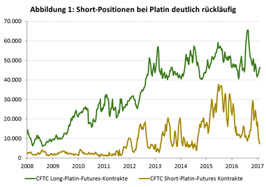Betrachtet man die aktuellen Bewegungen, hat der Platinkurs jüngst seinen gleitenden 200-Tage-Durchschnitt von 1.011 USD/oz und sein Fibonacci Retracement von 38,2 Prozent durchbrochen. Zudem hat sich der Preis eine Woche lang oberhalb der psychologisch wichtigen Marke von 1.000 USD/oz gehalten. Die spekulativen Positionen am Terminmarkt haben ihr 5-Jahres-Mittel durchbrochen, da sich Long-Positionen von ihren Dezember-Tiefs erholten und Short-Positionen das niedrigste Niveau seit etwas zweieinhalb Jahren verzeichneten (August 2014, s. Abb. 1). All dies lässt auf ein gewisses Korrekturpotenzial schließen. Solange der US-Dollar jedoch nicht wieder aufwertet, könnte sich der Aufwärtstrend aber kurzfristig (in den nächsten paar Monaten) fortsetzen, zumal der Preis, wie erwähnt, bereits längere Zeit wichtige technische Marken überschreiten konnte.