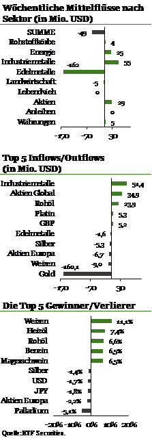Gold-ETPs verzeichneten hohe Abflüsse, da mit einer Normalisierung der Geldpolitik gerechnet wird. Positive Überraschung der chinesischen Fertigung stützte die Nachfrage nach Industriemetall-ETPs. Temporäre Faktoren verliehen den Rohölpreisen Auftrieb und sorgten bei Rohöl-ETPs für Zuflüsse.