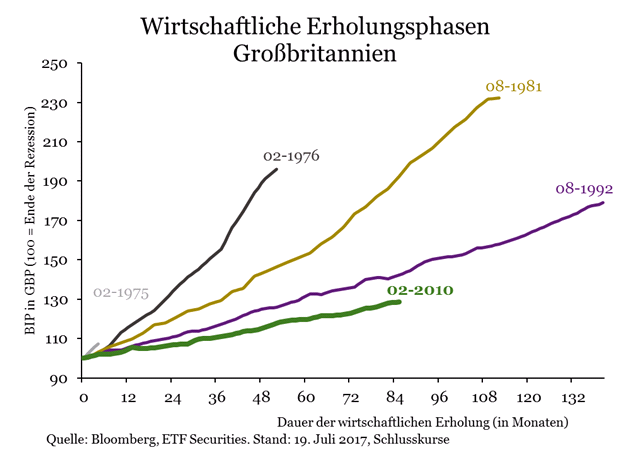 Infolge der angespannten Brexit-Verhandlungen sind in den letzten Monaten Zweifel über den Ausblick für das Wirtschaftswachstum in Großbritannien aufgekommen. Mit Blick auf die Wirtschaft weist die derzeitige Erholungsphase, nachdem Großbritannien die Rezession im Februar 2010 hinter sich gelassen hat, die schwächste Entwicklung der fünf Erholungsphasen infolge von Rezessionen seit den 1950er-Jahren auf, aber bei Weitem nicht die längste.
