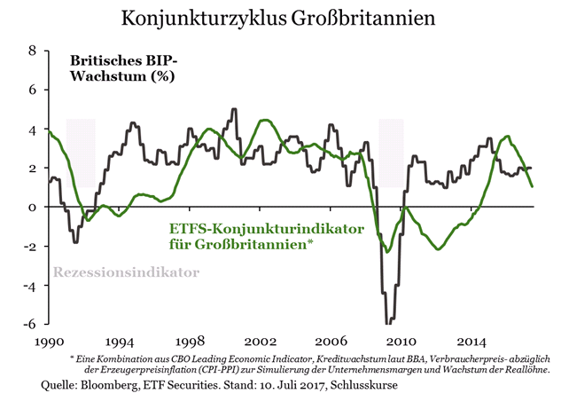 Besorgniserregend dabei ist, dass die britische Wirtschaft laut unserem Konjunkturindikator im kommenden Jahr eine Phase sehr niedrigen Wachstums verzeichnen könnte. Unserer Ansicht nach würde nur eine starke Erholung beim Pfund Sterling sowie beim Kredit- und Lohnwachstum zu einem besseren Ausblick für Großbritannien führen. Da nach wie vor unklar ist, wie sich die Brexit-Verhandlungen entwickeln werden, ist eine Rezession zu diesem Zeitpunkt nicht auszuschließen.