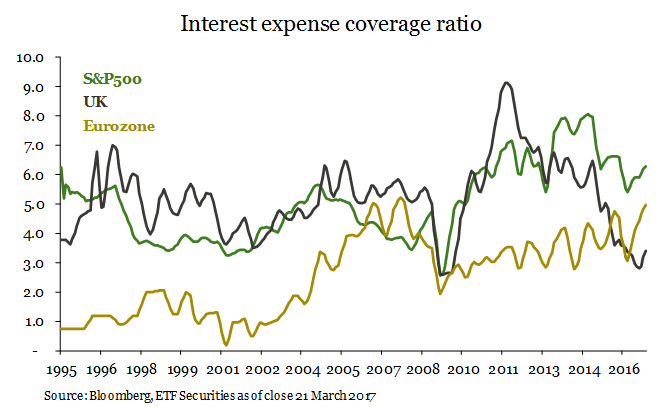 Aus unserem Bericht Vulnerabilities exposed by rising interest rates geht hervor, dass Europa und die USA, als Gesamthaushalte betrachtet, im regionalen Vergleich die höchsten Zinsdeckungsquoten aufweisen, wohingegen sie bei britischen Unternehmen deutlich von 9 (2012) auf nunmehr nur 3,4 gefallen sind. Der FTSE ist daher deutlich anfälliger für Zinsanstiege und rückläufige Gewinne infolge einer schwächeren Wirtschaft, was den Ausblick für das Wirtschaftswachstum potenziell belastet. Die anfälligsten Sektoren in Großbritannien sind jene mit Bezug zu Ressourcen und Immobilien.