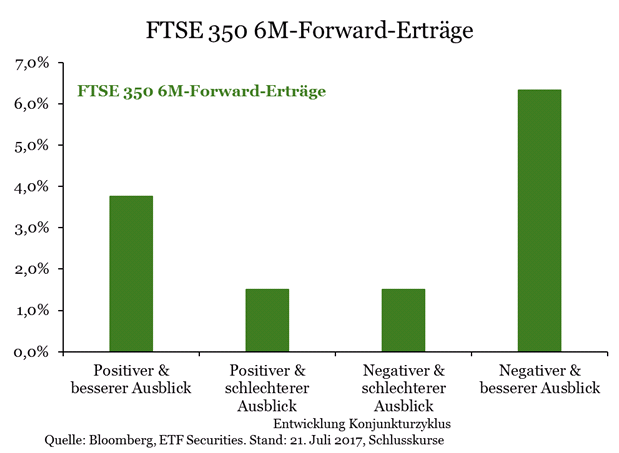 Unseres Erachtens sind die positiven Währungseffekte auf die Aktienbewertungen vorübergehender Natur. Unser Konjunkturindikator deutet darauf hin, dass sich der Wachstumsausblick in Großbritannien verschlechtert und ins Negative drehen dürfte. In einem solchen Umfeld ist der FTSE 350 in der Vergangenheit über einen 6-Monats-Zeitraum um 2,2 Prozent gestiegen. Am besten entwickeln sich in dieser Phase defensive Sektoren, wie z.B. Versorger und Verteidigungsunternehmen, und solche, die Unternehmen Kosteneinsparungen bieten können, wie Software und Computer-Dienstleistungen.