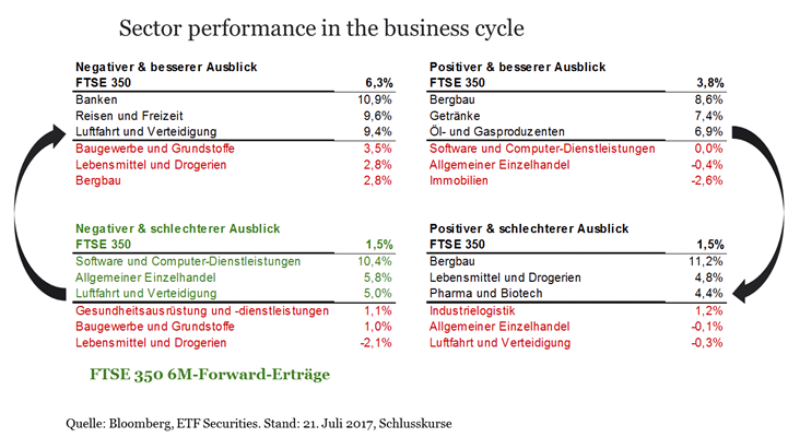 Historisch betrachtet hat sich der FTSE 350 in verschiedenen Phasen des Konjunkturzyklus unterschiedlich entwickelt. Teilt man den Zyklus in vier Phasen auf, lassen sich klare Unterschiede in der Sektorperformance erkennen. Der FTSE 350 entwickelt sich in der Regel am besten, wenn der Zyklus negativ ausfällt, sich aber allmählich eine Erholung abzeichnet, und am schlechtesten, wenn der Zyklus nach einer Phase starker wirtschaftlicher Performance allmählich eine Wende verzeichnet.