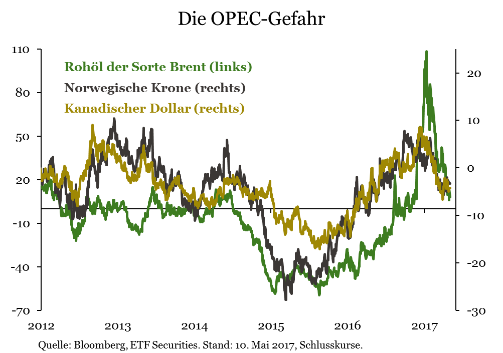 Beim kanadischen Dollar und bei der norwegischen Krone wird Rohöl die binnenwirschaftlichen Gegebenheiten als richtungsbestimmende Faktoren nicht nur ergänzen, sondern außer Kraft setzen. Insbesondere da sich die Währungen nahe mehrmonatiger Tiefs befinden und die Gefahr zusätzlicher Verluste besteht, ist das nächste OPEC-Treffen für sie von großer Bedeutung. Unseres Erachtens kann dieses Treffen nur zwei einander ausschließende Ergebnisse haben – entweder wird die Förderkürzung verschärft oder es passiert nichts. Da wir Letzteres für wahrschein-licher halten, dürften Rohöl, der kanadische Dollar und die norwegische Krone im Zuge der allgemeinen Enttäuschung unter Druck geraten. Tatsächlich ist die Einhaltung von Förderquoten für die OPEC seit langem ein Problem, und diesmal ist es nicht anders: Die Förderziele von 2016, die von Vornherein nur Schall und Rauch waren, haben den gewünschten Effekt verfehlt. Die Welt schwimmt weiter in Öl. Das Problem besteht also darin, dass die OPEC eine Einigung erzielen muss. Da aber die meisten ihrer Mitglieder keinen finanziellen Grund für Förder¬kür¬zungen haben, sind sie unseres Erachtens unwahrscheinlich.