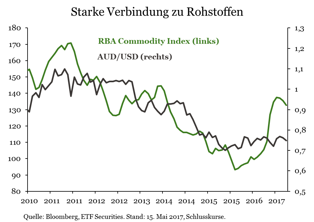 Das reale Austauschverhältnis Australiens, das heißt, die Einnahmen für die Ausfuhren im Verhältnis zu den Ausgaben für die Einfuhren, und der australische Dollar (AUD) sind eng miteinander korreliert. Eisenerz ist ein wichtiges Exportgut und Australien dessen weltweit größter Exporteur. China ist als größter Eisenerz-importeur Australiens wichtigster Handelspartner, sodass die chinesische Wirtschaft die Entwicklung des australischen Dollar maßgeblich mitbestimmt. Dass hinsichtlich der chinesischen Wirtschaft Bedenken aufkamen, war folglich eine Belastung für die Währung. Chinas wirtschaftliche Stabilisierung wird das Abwärtspotenzial des Australdollar zwar begrenzen, doch werden das Bild, das die schwache heimische Wirtschaft abgibt, und die neutrale Geldpolitik der Notenbank in den nächsten Monaten zu einer neuerlichen Abwärtsbewegung führen.