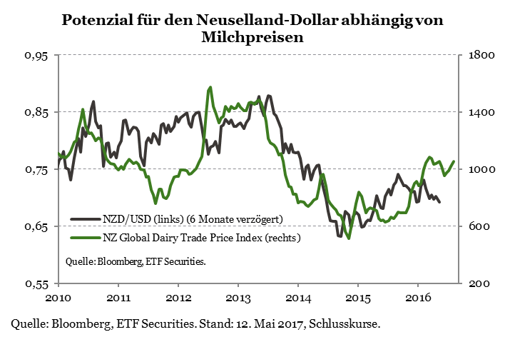 Die neuseeländische Zentralbank (RBNZ) hat wie ihr australisches Pendant einen moderaten Ausblick beibehalten. Sie ist optimistisch, dass die anhaltende Schwäche ihrer Währung dazu beiträgt, dass sich die Wachstumsaussichten aufhellen. Da sie ferner davon ausgeht, dass die Zinsen bis zum dritten Quartal 2019 unverändert bleiben, scheint es keine internen Faktoren mehr zu geben, die eine signifikante Aufwärts¬bewegung des Neuseeland-Dollar auslösen könnten. Lediglich die wichtigsten Rohstoffexporte des Landes, die Milch¬produkte, könnten noch für Aufwärtspotenzial sorgen. Milchprodukte, die zu 95 Prozent für den Export erzeugt werden, machen 25 Prozent der Gesamt¬ausfuhren aus. Auch hier ist China, Neuseelands größter Exportmarkt für Milchprodukte, der entscheidende Faktor. Zwischen Dezember 2015 und März 2017 stiegen die Exportpreise für Milchprodukte um 29 Prozent. Wenn der Trend anhält, werden die Gesamtexporte die zentrale Annahme der neuseeländischen Notenbank übertreffen und eventuell dem Neuseeland-Dollar Auftrieb verleihen.
