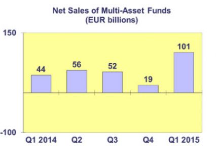 Aktienfonds, die im Jahr 2014 von Quartal zu Quartal weniger Zuflüsse verzeichneten und im Endquartal sogar netto fünf Milliarden Euro verloren, vertrauten Anleger jetzt 39 Milliarden Euro an. Rentenfonds sammelten 77 Milliarden Euro ein. Am beliebtesten waren in Q1 aber Mischfonds: Multi-Asset-Produkte generierten Nettozuflüsse in Höhe von 101 Milliarden Euro.