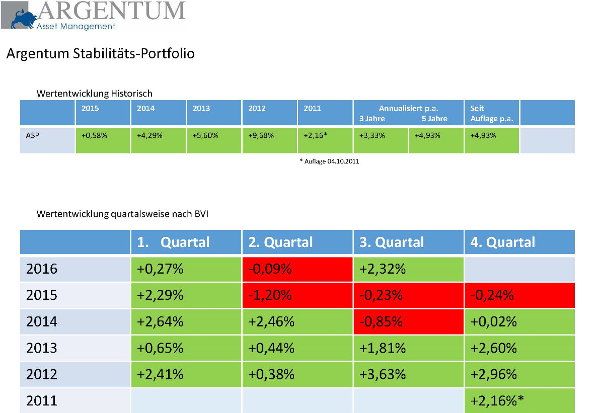 Ansprechen will der Fonds mit dieser Strategie Anleger, die Wert auf eine breite, konservative Risikostreuung legen, regelmäßige planbare Entnahmen tätigen wollen, einen Anlagehorizont von drei Jahren haben und sich – natürlich – Stabilität im Portfolio wünschen. 27,4 Millionen Euro haben Anleger der Strategie bereits anvertraut. Wer seit 2011 dabei ist, kann sich zum fünften Geburtstag des Fonds über eine Rendite von 25,6 Prozent freuen. 2015 gab es zwar nur ein geringes Wachstum von 0,58 Prozent. Doch 2014 (4,3 Prozent), 2013 (5,6 Prozent) und 2012 (9,7 Prozent) sprechen für sich. Über die vergangenen drei Jahre, den Anlagehorizont, den Anleger mitbringen sollten, ergibt das einen Zuwachs von 3,33 Prozent per anno. Und das bei einer Volatilität von 2,35 Prozent. Mit diesem Ergebnis steht der Argentum Stabilitäts-Portfolio 1 über drei Jahre an der Spitze der fast 2.000 Fonds starken Peergroup Mischfonds Aktien und Anleihen global des FINANZEN FundAnalyzers (FVBS). Von fast 2.000 Fonds landet der Argentum-Fonds in punkto Schwankungsbreite auf Platz 16. Gleichzeitig schafft jedoch kein Fonds mit einer besseren oder ähnlichen Platzierung in Sachen Volatilität eine höhere Rendite (0,9 Prozent bis 1,95 Prozent Rendite über drei Jahre p.a.) zu erzielen.