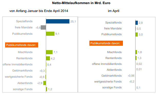 Die deutsche Fondsbranche hat von Januar bis April 28,6 Milliarden Euro an neuen Mitteln eingesammelt. Das geht aus einer aktuellen Statistik des Bundesverbandes Investment und Asset Management e.V. (BVI) hervor. Allein im April investierten Anleger 6,4 Milliarden Euro. Davon entfielen drei Milliarden Euro allein auf Publikumsfonds. Spezialfonds lagen mit 2,9 Milliarden Euro knapp dahinter. Auch Aktienfonds, die zwischen Januar und April insgesamt 2,9 Milliarden an Abflüssen verkraften mussten, konnten zulegen. Allerdings nur wenig: In sie flossen im April zehn Millionen Euro. Mischfonds bleiben unter den Publikumsfonds die beliebtesten Produkte. Sie führen im April mit Zuflüssen von netto 1,8 Milliarden Euro die Absatzliste an. Auch auf Jahressicht liegen sie mit 7,1 Milliarden Euro vorne. Rentenfonds generierten im April 1,3 Milliarden Euro.