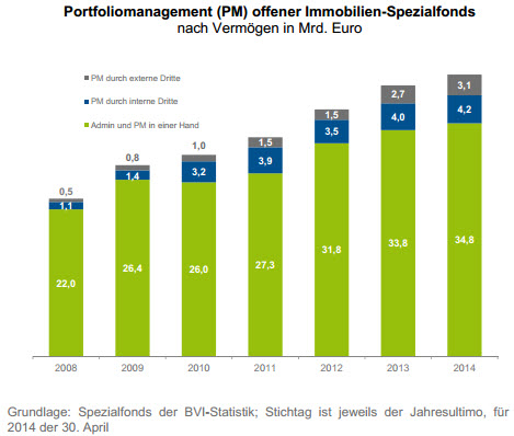 Eine zunehmende Arbeitsteilung zeigt sich bei den offenen Immobilien-Spezialfonds. 2008 lagen das Portfoliomanagement und die Administration noch bei knapp 93 Prozent des dort verwalteten Vermögens in einer Hand. Nur bei den übrigen sieben Prozent der Assets waren die Aufgaben an spezialisierte Dienstleister verteilt. Inzwischen ist dieser Anteil auf 17 Prozent angestiegen. Der BVI erwartet eine weitere Zunahme, da Anbieter aufgrund des neuen Kapitalanlagegesetzbuches (KAGB) auf eine KVG-Lizenz verzichten und stattdessen Dienstleistungen von Dritten in Anspruch nehmen könnten.