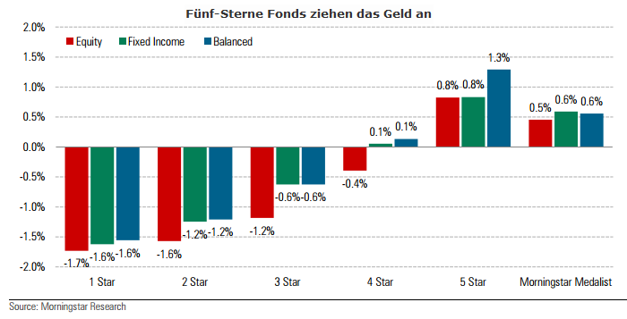 Weniger überraschend ist es laut der Morningstar-Analyse, dass sich Fonds, die mit Rating-Sternen ausgezeichnet worden sind, leichter verkaufen lassen. Während Fonds mit unterdurchschnittlichen Ratings (1 und 2 Sterne) sowie durchschnittlichen Ratings (3 Sterne) die Mittelzuflüsse negativ beeinflussen, ziehen mit Fünf Sternen bewertete Fonds Gelder an. Interessant ist dabei, dass eine Sterne-Bewertung von den Anlegern völlig unabhängig von der Performance eines Fonds wahrgenommen wird.