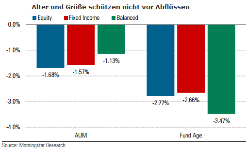 Interessanterweise ziehen auch neue Fonds verstärkt Anlegergeld an: Das Alter eines Fonds steht in einem inversen Verhältnis zu seinem Wachstum. Konkret: Je länger ein Fonds am Markt ist, desto träger werden die Zuflüsse in den Fonds. Der Grund: Vor allem an den Bankschaltern gelten neue Fonds als ein sehr wichtiger Faktor im Vertrieb. Das Sterne-Rating spielt hier natürlich keine Rolle, denn Ratings werden in der Regel erst nach einer Mindestfondshistorie von drei Jahren vergeben.