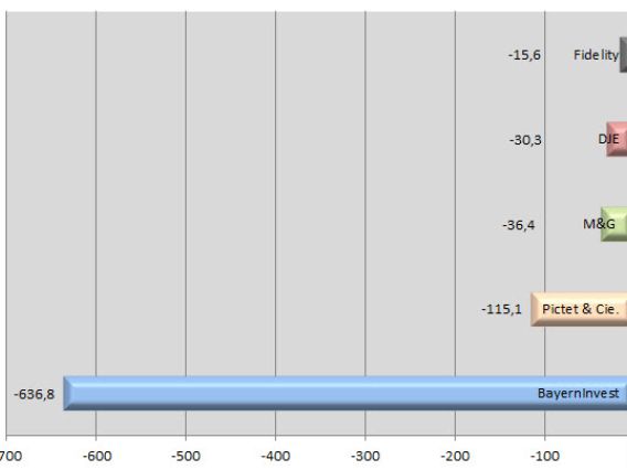 Einige Gesellschaften mussten jedoch auch Abflüsse hinnehmen. Die größten hatte die BayernInvest Gruppe zu beklagen. Ihr entzogen Anleger im Februar netto 636,8 Millionen Euro. Bei Pictet & Cie. beliefen sich die Abflüsse auf 115,1 Millionen Euro.