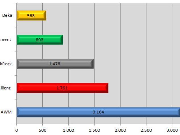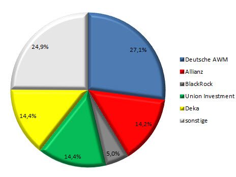 Die Aufholjagd hat hingegen BlackRock begonnen. Die deutsche Sparte des weltweit größten Vermögensverwalters hat zwar nur einen Marktanteil von 5,0 Prozent. Doch im Februar vertrauten Anleger der Gesellschaft 1,48 Milliarden Euro an, wodurch das in Deutschland verwaltete Vermögen auf 39,04 Milliarden Euro anstieg.