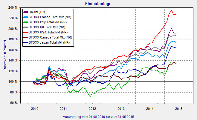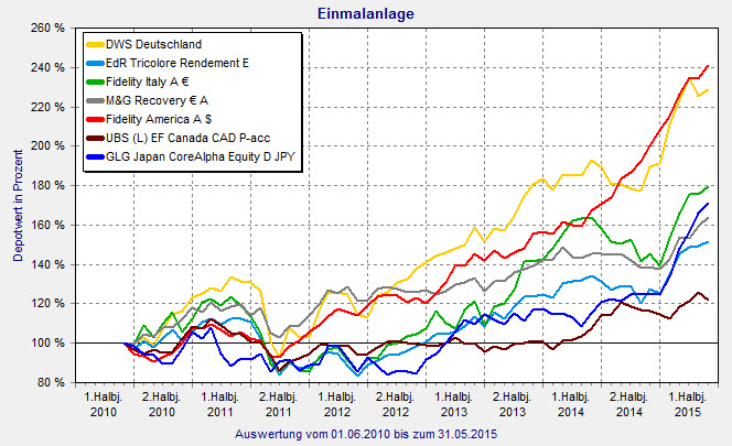 Drittes kontinentaleuropäisches Land der G7 ist Italien. Das Krisenland stellt den am besten bewerteten Fonds der Gipfelstaaten: Der Fidelity Italy (ISIN: LU0048584766) hat ein Volumen von 1,4 Milliarden Euro und trägt als einziger die FondsNote 1. Mit dem im Oktober 1990 aufgelegten Fonds erreichte Fondsmanager Alberto Chiandetti im laufenden Jahr bisher ein Plus von starken 28,8 Prozent. Zum Vergleich: Der italienische Aktienmarkt erreichte in den ersten fünf Monaten 2015 ein Plus von 19,7 Prozent. Im vergangenen Jahr lief allerdings einiges schief: Während der Gesamtmarkt auf ein Plus von 2,7 Prozent kam, verlor Chiandetti 2,3 Prozent. Das lässt sich allerdings als Ausrutscher verzeichnen. Für den Zeitraum von drei Jahren schaffte er eine Outperformance von über 20 Prozent zum Gesamtmarkt und über vier Jahre steigerte der Fonds seinen Wert um 50,7 Prozent, was einer Outperformance von fast 30 Prozent entspricht. Top-Holding ist das Kreditinstitut Intesa Sanpaolo. Dahinter folgen der Stromversorger Enel und die Großbank UniCredit.
